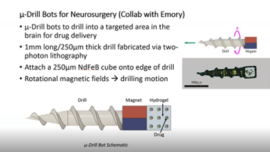 He manipulates the tiny instruments through magnetic fields to perform actions, such as delivering drug particles to reduce the size of a tumor or drilling through brain tissue during neurosurgery.