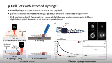 “When the microbot finds an acidic pH level, the hydrogel will expand and release the drugs into the brain tumors,” he explains. “Our tests show this type of hydrogel has a higher release rate and a higher response rate in a tumor’s extracellular environment versus normal, pH level tissue.”